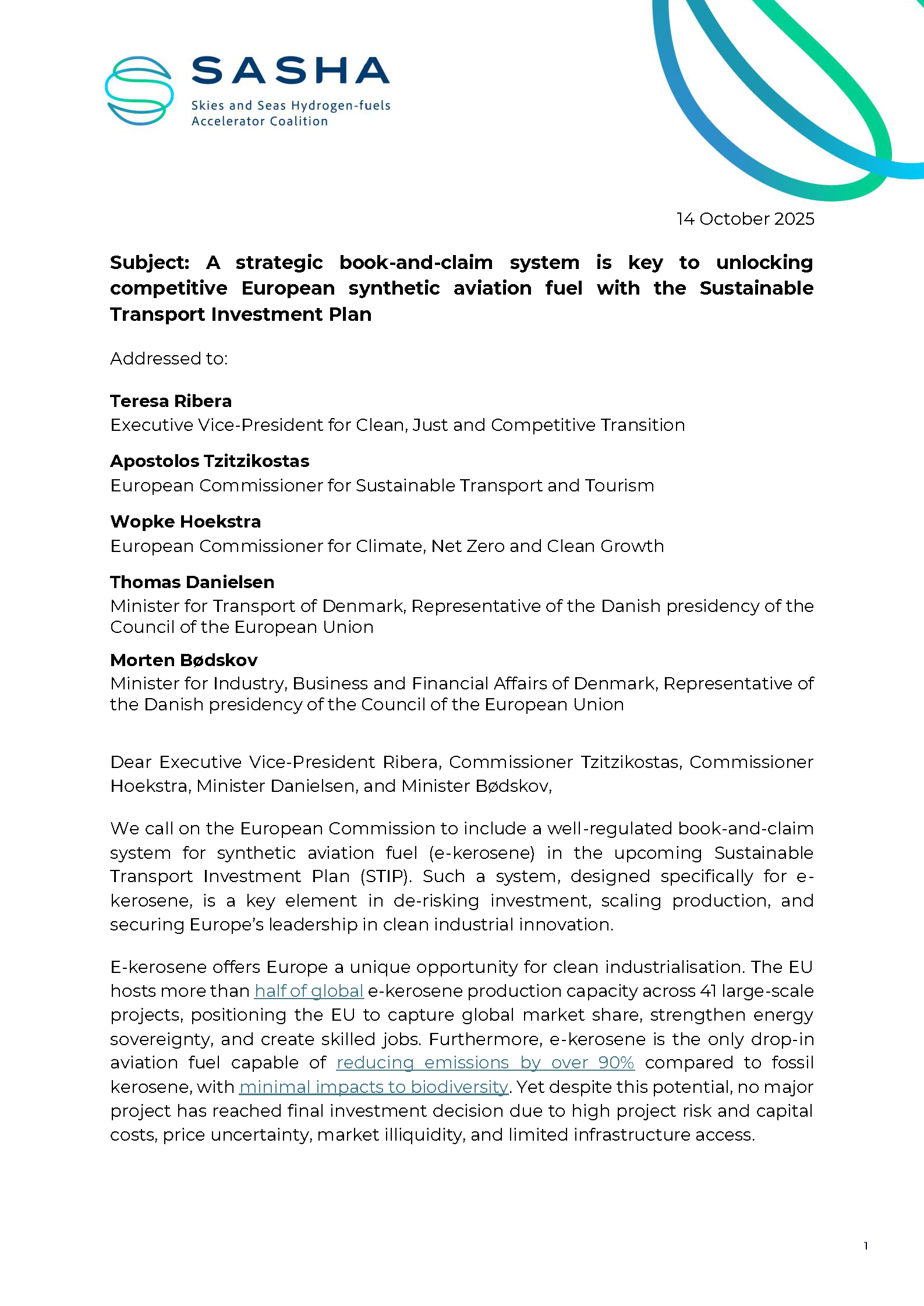 For this reason, the SASHA Coalition wrote a letter to European Commissioners and the Danish Presidency of the Council of the EU recommending that a well-regulated book-and-claim system for e-kerosene is introduced in the upcoming STIP.